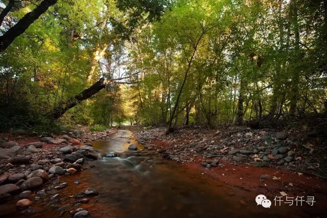 潺潺流淌的小溪和郁郁葱葱的树林,配合着夕阳余晖,柔和光线添增了红岩的美。