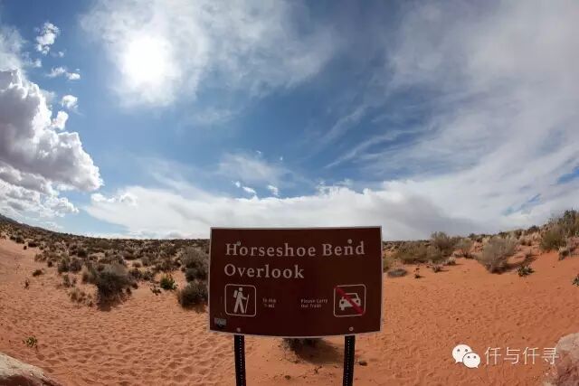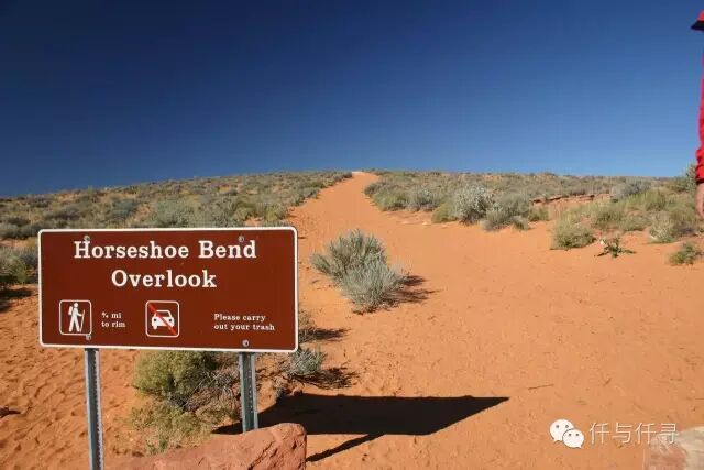 所幸公路建设完备,从佩吉小镇(Page)开89号公路往南经Walmart,不到2mile后,就可以看见路旁scenicview的咖啡色路标——HorseshoeBend Overlook Trail。