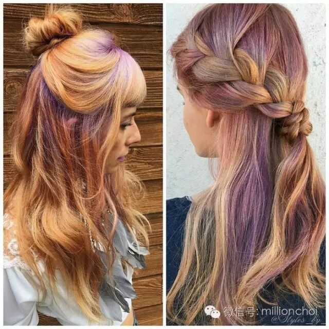 这个发色上相度一流,暗色蜜桃搭配上神秘的紫色交错其中,不管是绑个半丸子头,或是编辫子,都有不同层次变化展现。