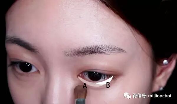 接着把眼影刷剩余的颜色画在下眼尾的后1/3的地方(B区),接着再拿珠光眼影打亮下眼线的前端2/3(A区)