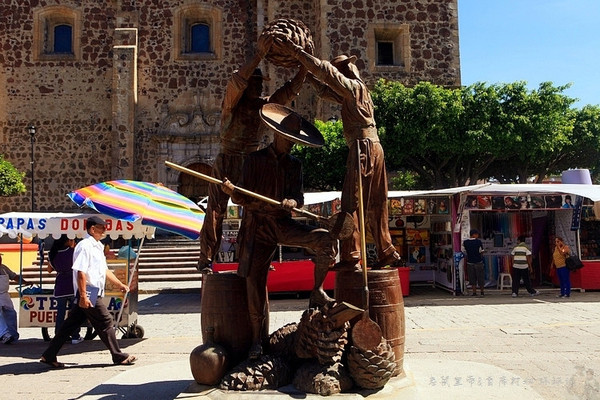 小镇上的雕塑展示的是为龙舌兰果剥皮的情景