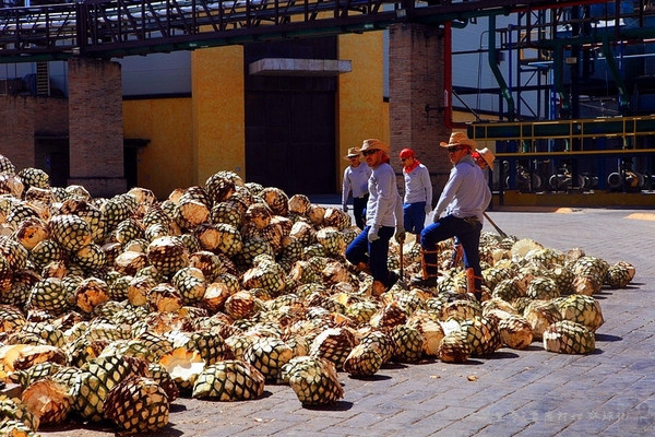 Tequila 小镇非常漂亮,房屋五颜六色,街面店铺装点得绚丽多姿。参观龙舌兰酒厂La rojena的门票是180比索,有英文导游,可以参观压榨、发酵、蒸馏和储藏过程,全程约需1小时。龙舌兰酒的原料是一种叫做Agave(龙舌兰)的植物的根果—Pina,其果实状如菠萝。将新鲜的龙舌兰割下后去皮浸泡24小时,然后榨出汁来,汁水加糖发酵两天至两天半,经两次蒸馏后出酒,初酒酒精度可达52-53度,香气突出、口味凶烈。经放入橡木桶中陈酿后,其色泽和口味更佳。墨西哥人对Tequila酒情有独钟,而且喜欢在饮酒时先在手背上倒些海盐末(或在酒杯边缘抹上盐),并用腌渍过的辣椒干、柠檬干佐酒。Tequila酒是还酒吧里的六大基酒之一。