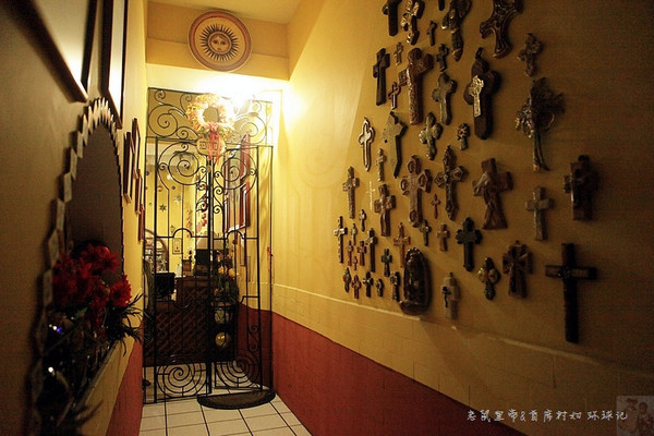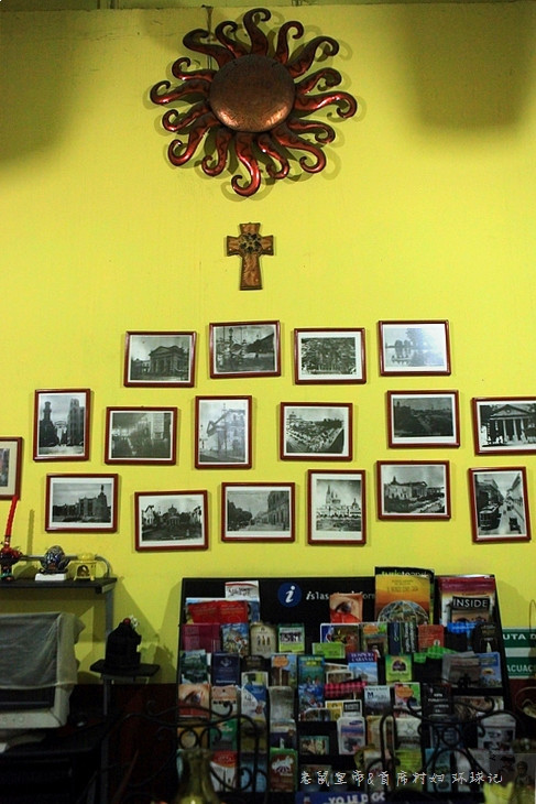 旅馆的门脸很小,一不留神就会错过。入口处过道的墙上挂满了各种造型的十字架,彰显着主人的信仰。