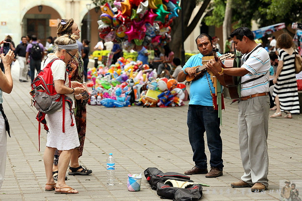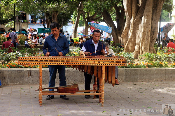 今天是周六,还是亡灵节第二天,广场上人很多,很多街头艺人在此演出。皇帝特喜欢这个由两个人合作表演的马林巴琴(Marimba),其形状很像竖琴,弹奏起来很好听。