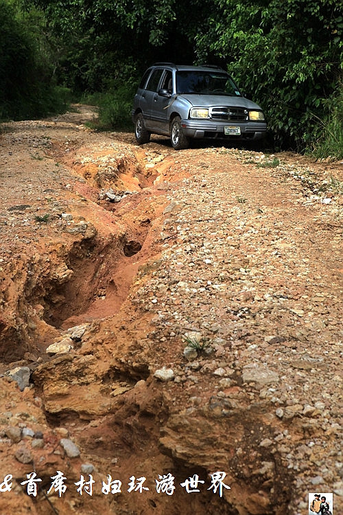 早饭后我俩提前十分钟来到租车公司,8点整公司上班,村妇上网下载了GPS地图,我俩开上车就走。一开始的大约7公里路是柏油路,路况很好,车子也不多。但很快就拐下柏油路,上到了泥路上。路挺宽,也算平整,但路面满是泥浆,车子极容易打滑。皇帝小心翼翼开了大约8-9公里,才拐上开往Barton Creek 的乡间小路。这条路是土石路,只有一台小车宽,在密林里上上下下穿行。由于前两天下大雨,绝大部分路面已被彻底破坏,不是一道道深沟就是一块块凸起的大石块。如果今天还下雨,陷车的可能性极大。这段路总长约7-8公里,皇帝装着胆子跌跌撞撞地往前开,大约走了5-6公里,迎面来了一辆大路虎,司机是一位南非人,他也是租的车,但不是去看门诺人,而是想去看Barton Creek 附近的溶洞,但他的车子无法穿越一条大水沟,只好原路返回。