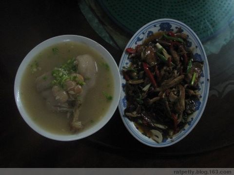 晚饭一份素炒野生杨柳菌,一份清炖蹄花,总计花了18元,可谓物美价廉。