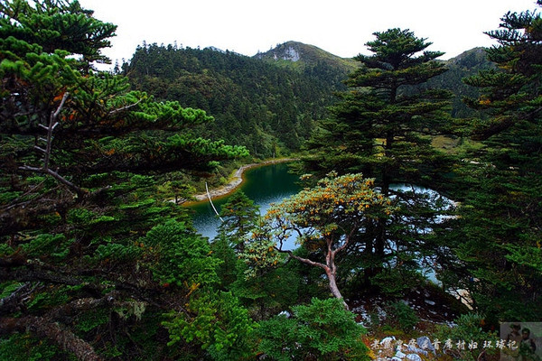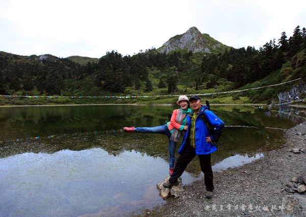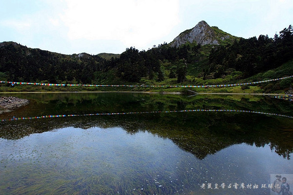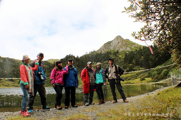 沿着木栈道下山,不知不觉间就来到了极富传奇色彩的灵犀湖,据当地人讲,每当月圆之夜湖边就有一头犀牛出现,它是石卡女神的座骑,保佑着这里民众的牛羊茁壮成长。灵犀湖西面是一座小山,远看犹如坐佛,当地群众称是强巴佛的化身。湖的四周树木葱笼杜鹃锦蔟,湖水碧绿如玉,生态植被保护得非常好。皇帝天生亲水,立即掏出笛子演奏,少不得被大家蜂拥围堵一顿狂拍。一曲高亢嘹亮的“青藏高原”过后,大家纷纷下到湖边,立即被这幽深宁静的美景陶醉,也顾不得自己形象是丑是俊,纷纷摆pose堆造型,将自家凡身和天赐灵湖紧紧粘在一起。