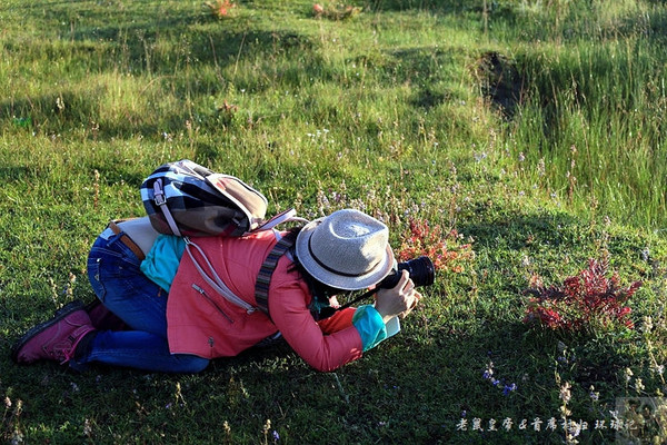 一大早,我们驱车直奔石卡雪山,中间在山脚下的纳帕海草原作短暂停留。在车上时,小伙伴们就被外面的草原鲜花远山云雾以及色泽艳丽的藏民居和公路两侧排成双列长队的玛尼堆惊呆了。捱不到车停稳就纷纷端着长枪短炮跳下去拍照。以村妇为代表的几位美女为了好拍花儿,竟扔了矜持和高傲,纷纷匍匐在地奋力工作,以至于其中一位美女险些丢了价值不菲的太阳镜。