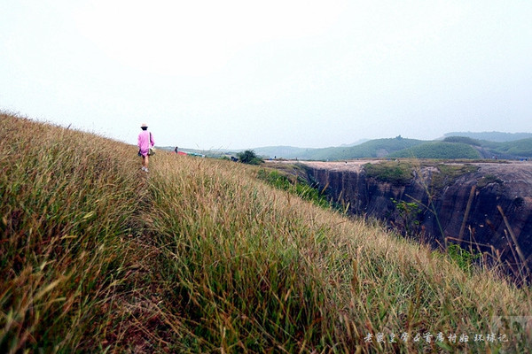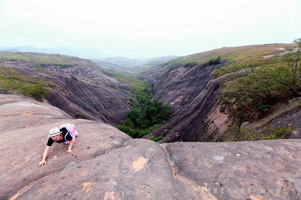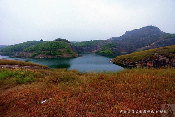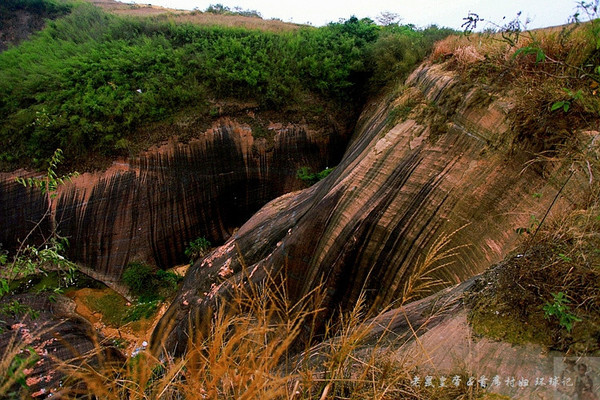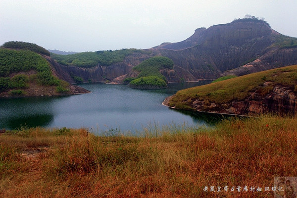 告别程江口,前往程水镇内大王寨,大王寨乃丹霞地貌景观区,丹霞地貌并不奇特,但此处妙就妙在那两个坑:此二坑分布在丹霞岩石左右,一侧雄奇险俊,坑内乱石横陈杂草丛生,另外一侧却是山清水秀温柔委婉,故前者称王后者唤作美人,一刚一柔,互相呼应,真真是天造地设。顺着二坑中间的山体继续往上,有一线天,看景区宣传照,上去之后可以拍出相当赞的集体照,奈何,哎,奈何我们居然没时间上去!