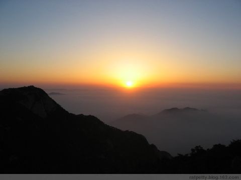我和仁者、攀岩、小溪四人上到玉皇顶没多久,太阳就在东边缓缓地探出了头来,从4:50-4:54分,我们全过程欣赏了泰山日出!