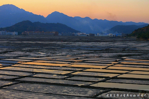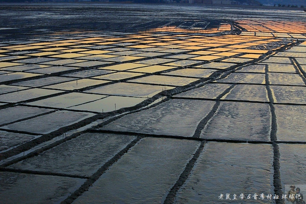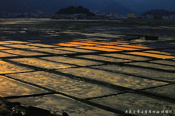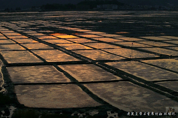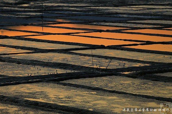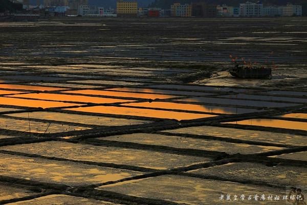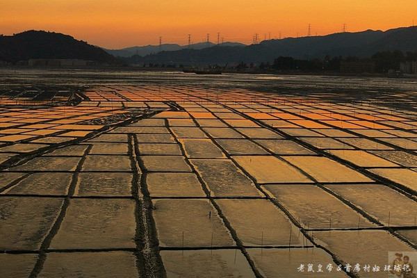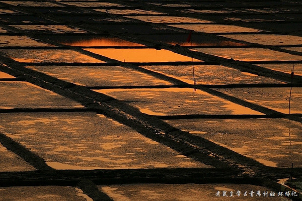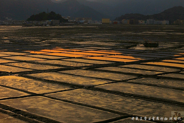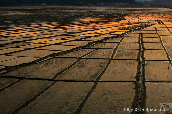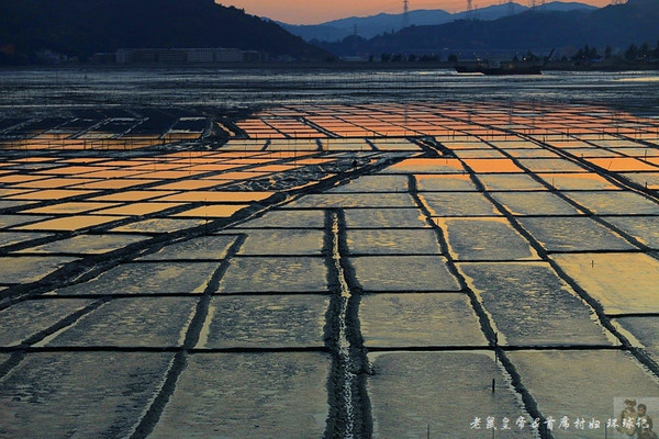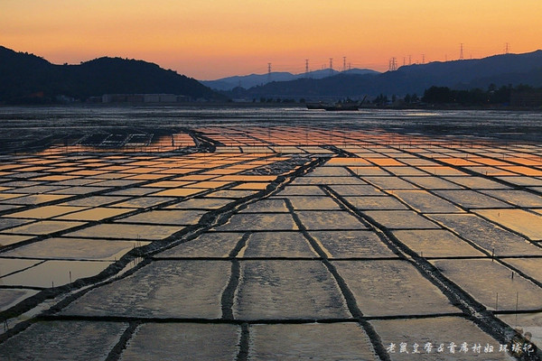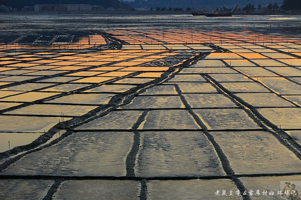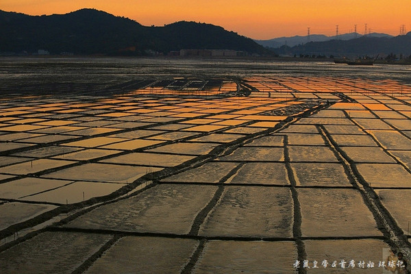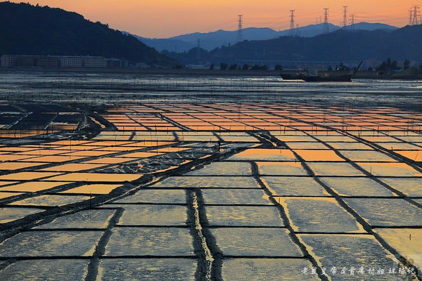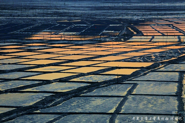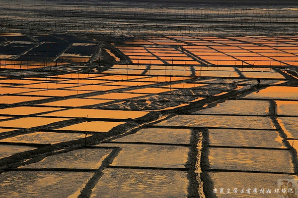 但见广阔的滩涂被均匀规整地分割成一个个小方块,有些方块没有水,有些有水,那些有水的方块贪婪地吸着光,小小的水面便呈现浓烈的橘红色,傲娇地回应着绚烂的天空。小方块明灭对比,高调与内敛并在。偶见渔人在小方块里劳作,那小小的一个黑点腾拿挪移,与山海和光共同创造出一个让人惊艳的存在。