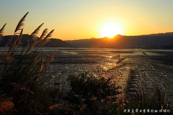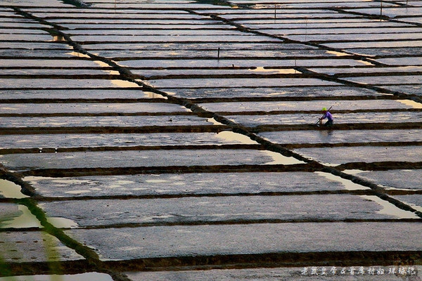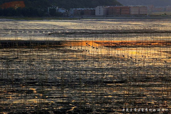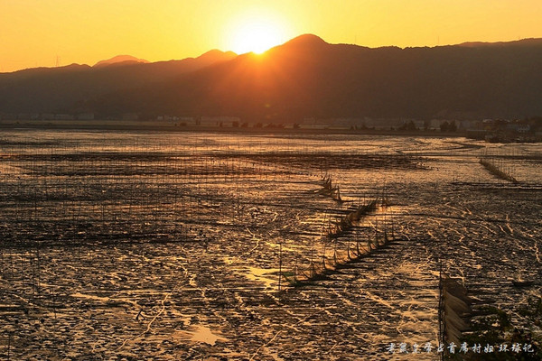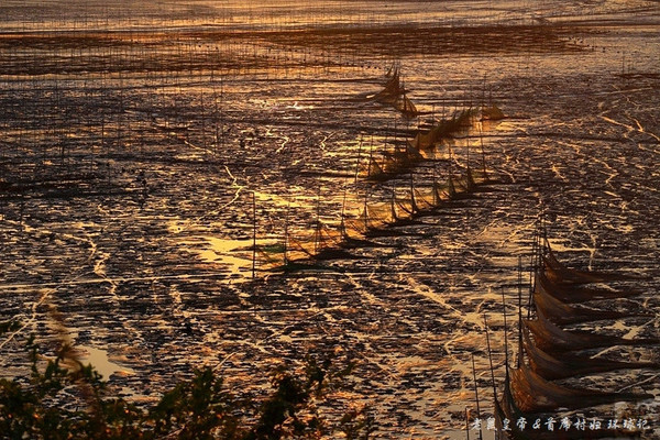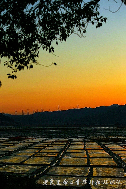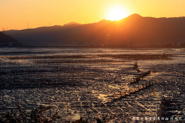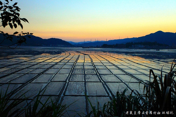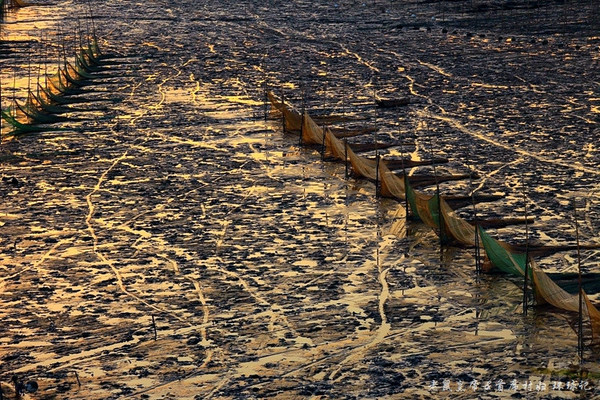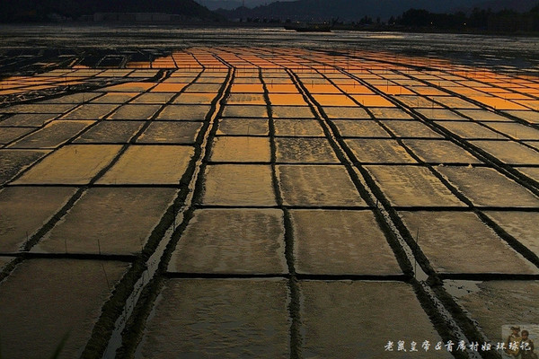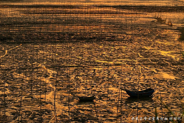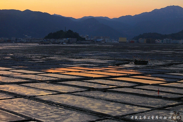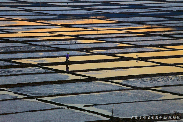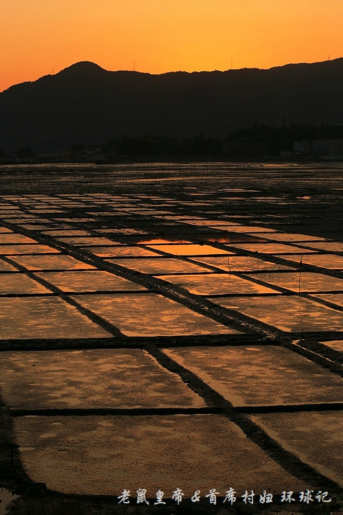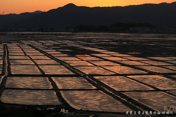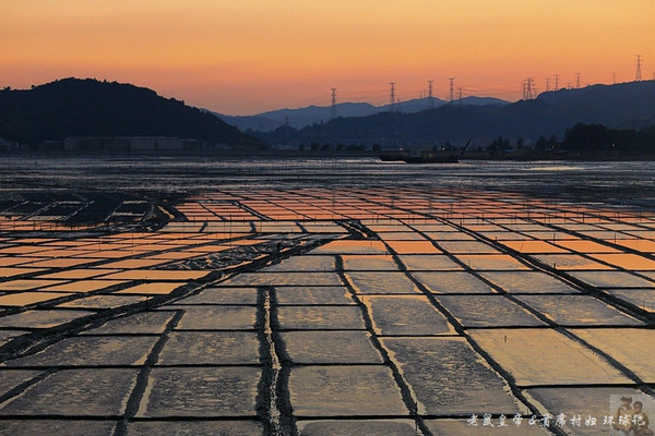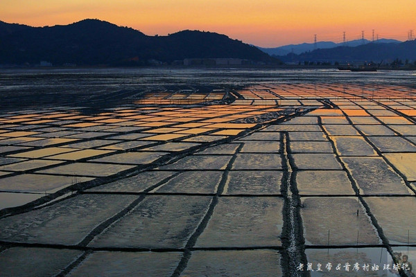但见广阔的滩涂被均匀规整地分割成一个个小方块,有些方块没有水,有些有水,那些有水的方块贪婪地吸着光,小小的水面便呈现浓烈的橘红色,傲娇地回应着绚烂的天空。小方块明灭对比,高调与内敛并在。偶见渔人在小方块里劳作,那小小的一个黑点腾拿挪移,与山海和光共同创造出一个让人惊艳的存在。
