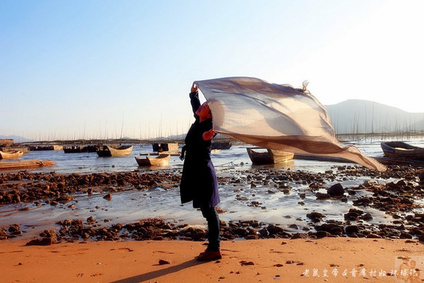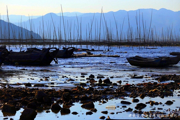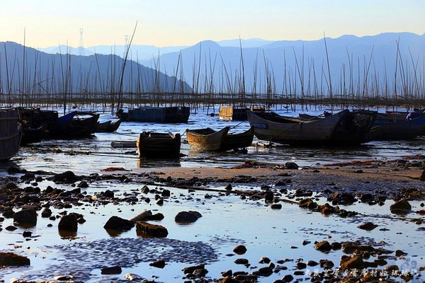说起来,见到小筼筜纯属意外事件。那天我们是冲着紫菜养殖滩涂而去,因为到达时间不对,导致双手完全不high。在回太姥山镇的路上,残阳如血,映红了天。海水褪尽,光线斜射下的滩涂闪闪发光,搁浅的小舟和泄了气的渔网彼此呼应,仿佛一对不能抱团取暖的恋人,满脸的倦怠。