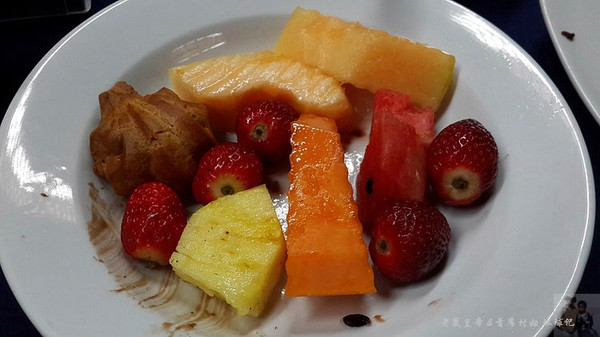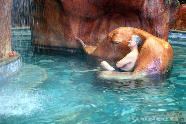 衣物箱须另付租金,每人6美元。我们没用,将换下来的外衣直接装包里了。换好衣服走进去一看,温泉浴区很大,据说总计共有25个不同温度的温泉池,还有水滑梯可玩呢。不知何故,今天来洗温泉的人不是很多,我俩不断地变换池子,还拍了很多照片。大约折腾了一个小多时,上岸更衣,打着雨伞来到了酒店内的大型自助餐厅。餐厅提供的晚餐价格仅为6美元/人(我们的晚餐是包在门票里面的,全包价35美元),是自助餐,非常丰盛,仅水果就有草莓菠萝哈密瓜等一大堆,还有巧克力浆用来配草莓。主食有牛肉、鱼、鸡和米饭面包等,还提供两种汤、三种鲜榨果汁、各种蔬菜沙拉以及多款甜品,每人6美元的价格绝对的超值。如果去洗温泉,自助餐一定不要错过!