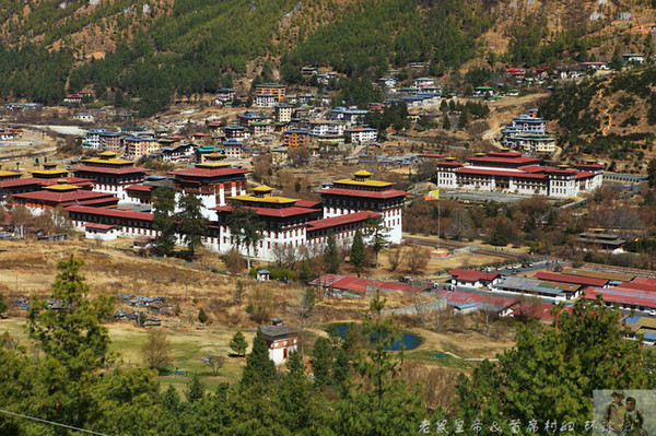 图中最显眼的是不丹政教合一的办公场所:宗。右侧靠边中间位置那个小小的建筑是国王的皇宫。