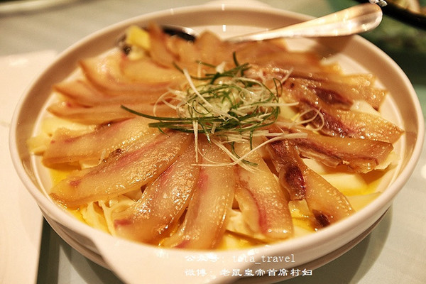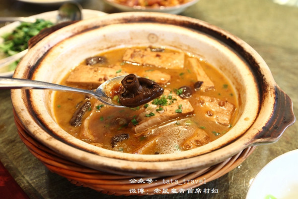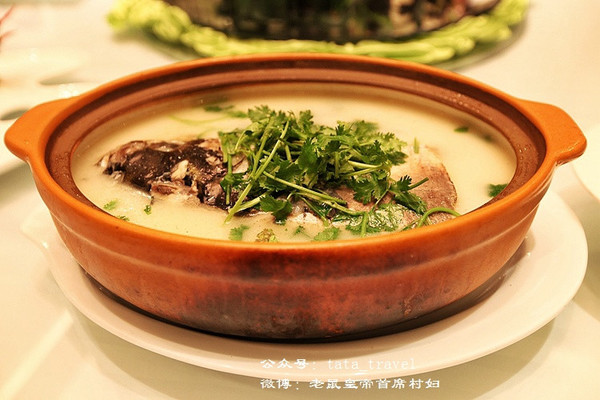 第一道要吃的是:天目湖砂锅鱼头。此菜必须以天目湖中天然生养的大灰鲢鱼头作原料,配以天目湖水为汤基,再置入上好陶土制作的宜兴砂锅,配以各种独特辅材,精心烹制两小时左右而成。煨制好的天目湖砂锅鱼头,汤色乳白、香气浓郁,鲜而不腥、肥而不腻。