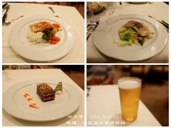 晚餐仍在提香餐厅54号座位。92老正太菜谱:开胃菜:排骨萝卜冬瓜汤;主菜:香煎剑鱼配地中海风味汁米饭和炒蔬菜;甜点:果酱蛋糕。皇帝菜谱:开胃菜:花菜浓汤;主菜:蒸鲽鱼配蔬菜和土豆泥;甜点:草莓香草冰淇淋。另,付费大杯扎啤6.31美元。
