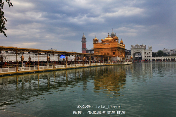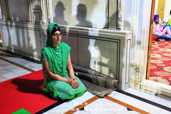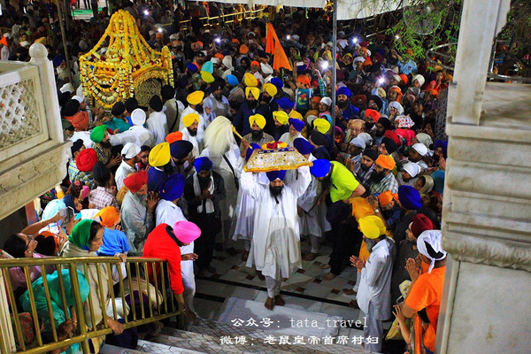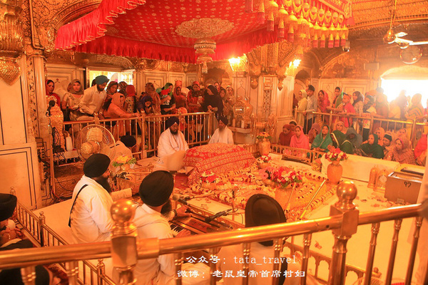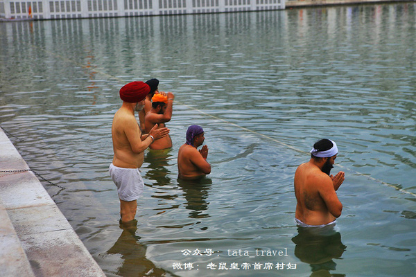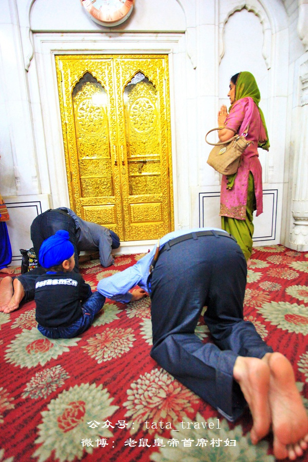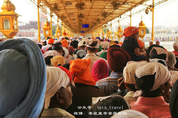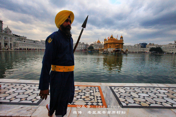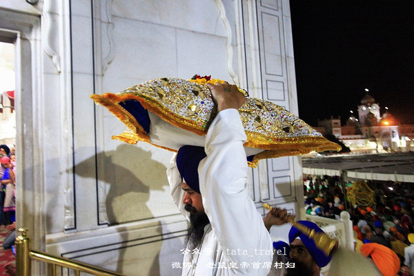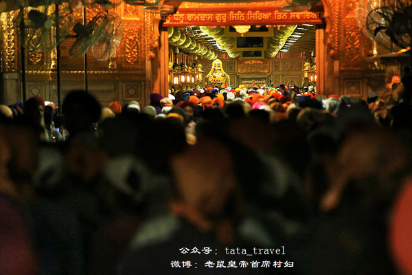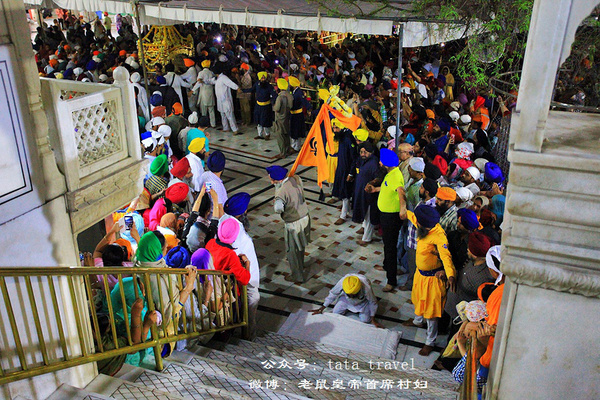 我们于黄昏时分进入金庙。庙宇四周华灯齐上,各式小摊热闹纷繁,但这份喧嚣却神奇地止步在金庙之外。脱鞋并寄存(免费)好之后,赤足过一小水池,经过一名身份黄色制服手持长矛的锡克卫士,穿过一高大的拱形门,但见一座金碧辉煌的方形庙宇立于水池中央,静穆而耀眼。作为锡克教的圣地,金庙距今已有超过400年的历史。