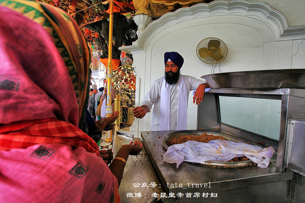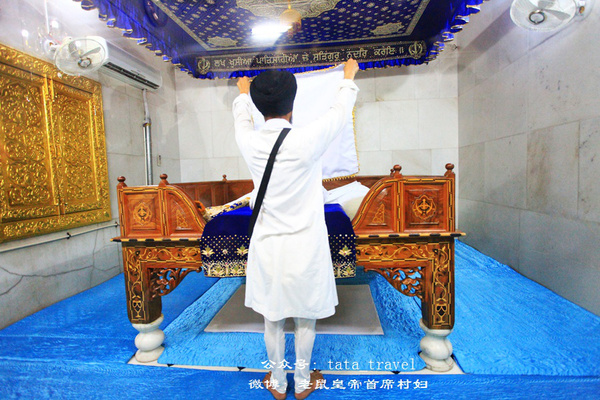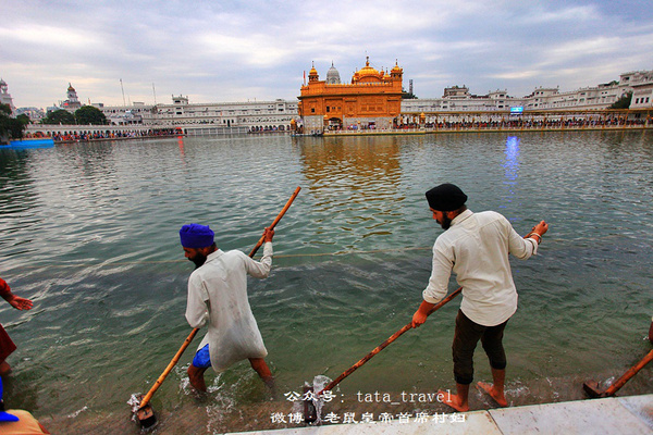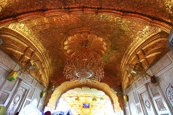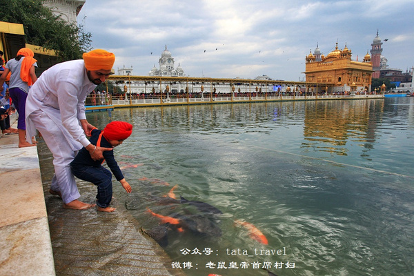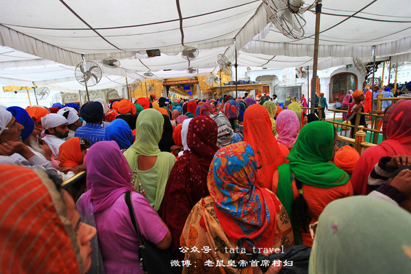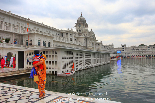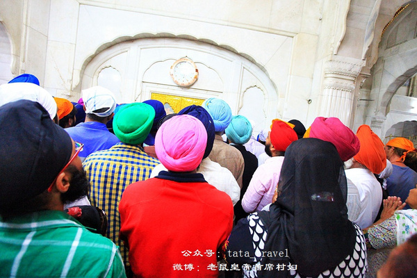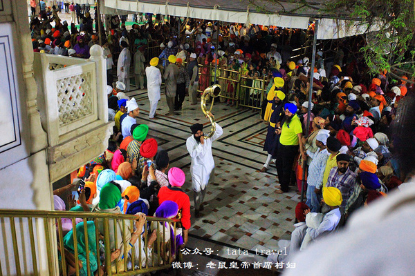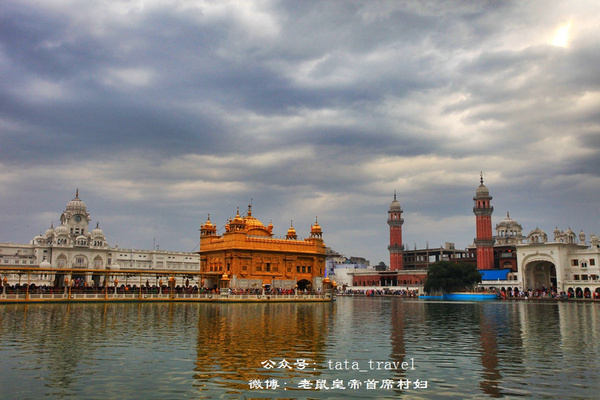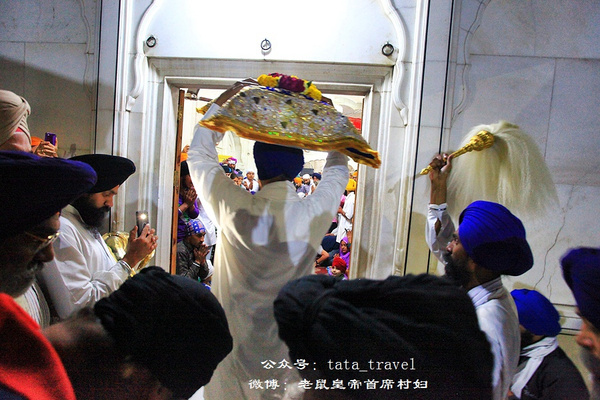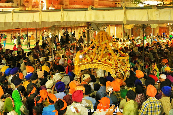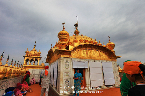 我们于黄昏时分进入金庙。庙宇四周华灯齐上,各式小摊热闹纷繁,但这份喧嚣却神奇地止步在金庙之外。脱鞋并寄存(免费)好之后,赤足过一小水池,经过一名身份黄色制服手持长矛的锡克卫士,穿过一高大的拱形门,但见一座金碧辉煌的方形庙宇立于水池中央,静穆而耀眼。作为锡克教的圣地,金庙距今已有超过400年的历史。