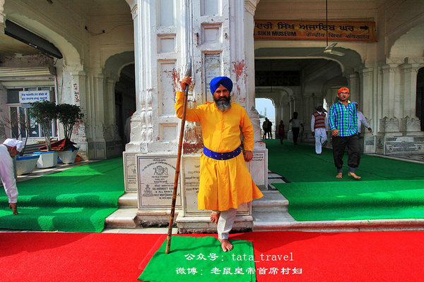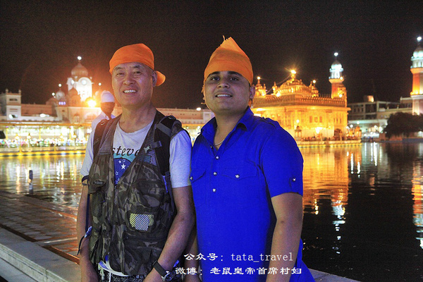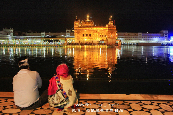 我们于黄昏时分进入金庙。庙宇四周华灯齐上,各式小摊热闹纷繁,但这份喧嚣却神奇地止步在金庙之外。脱鞋并寄存(免费)好之后,赤足过一小水池,经过一名身份黄色制服手持长矛的锡克卫士,穿过一高大的拱形门,但见一座金碧辉煌的方形庙宇立于水池中央,静穆而耀眼。作为锡克教的圣地,金庙距今已有超过400年的历史。