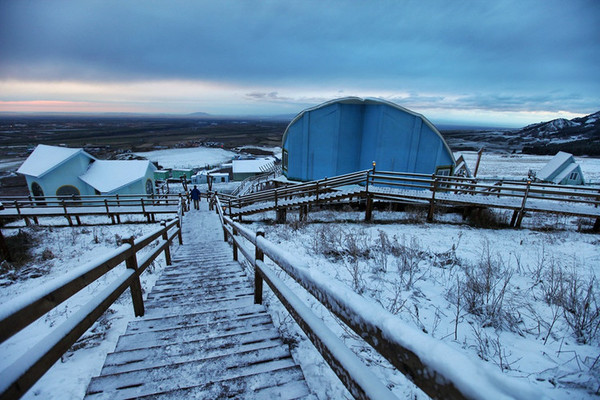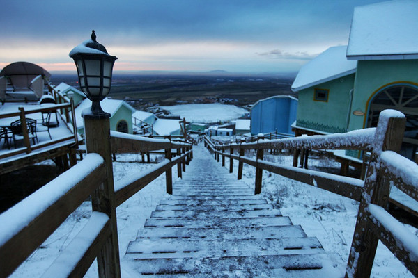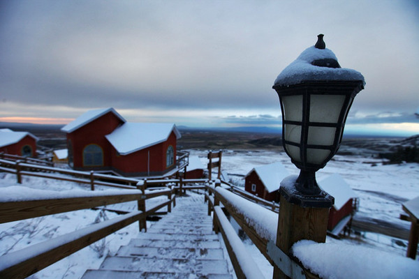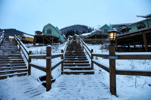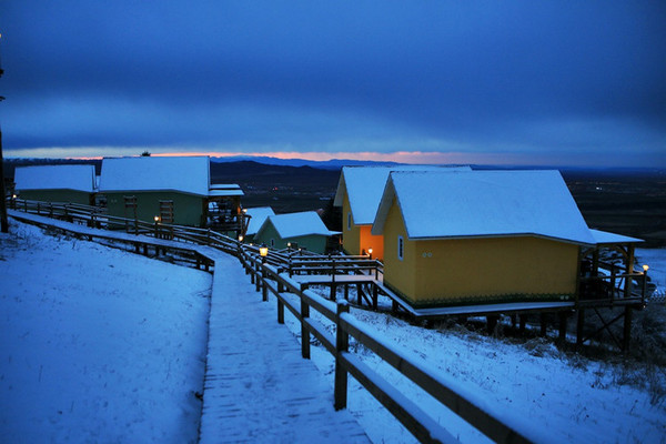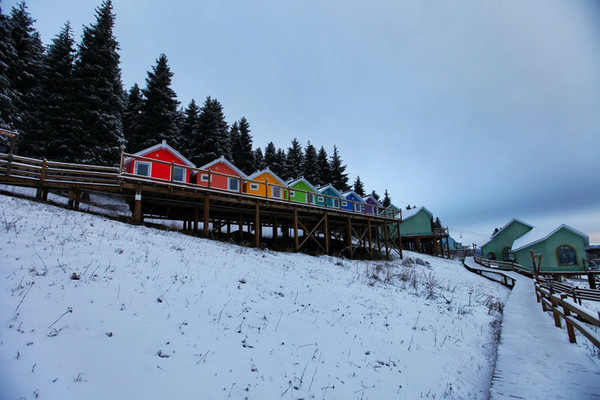苍茫浩淼的空间里,唯一能找寻的温暖就是这些造型各异,色彩不一的木质建筑了。