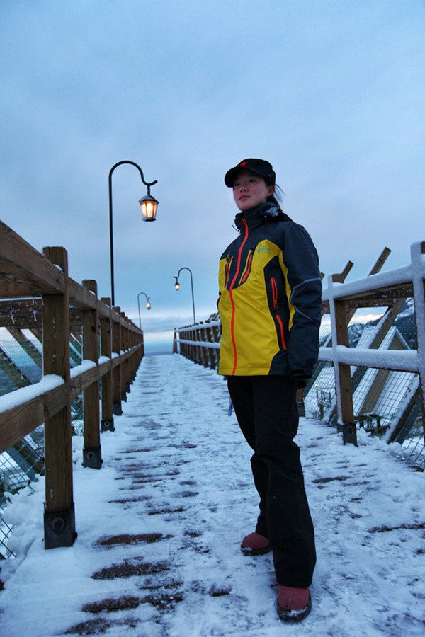 拾级而上,有这样一座不短不长的木桥,白雪和木头的组合居然让我们在这个飘雪的五月觉出些温暖的气息。