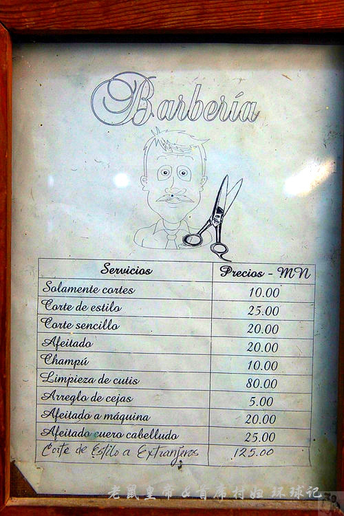 我们表示不能相信,古巴一大学助教月工资才20CUC,怎么可能理发比中国还贵?而且价目表上明显不是10就是20比索,至于最后一行125比索(25比索等于1CUC)我们理解是女性烫染头发的价格。