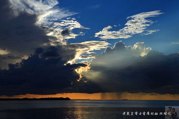 远处,云在变幻、能看得出有的地方大雨倾盆。随着云的变幻,渐行渐远的夕阳挣扎着将一束束光线透过云层洒向大海。在我们的眼帘中,多彩的云、绚烂的光、大海沙滩以及海边的一应物事构成了一幅绝美的画卷,让人惊叹,委实震撼。