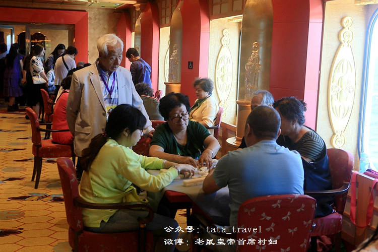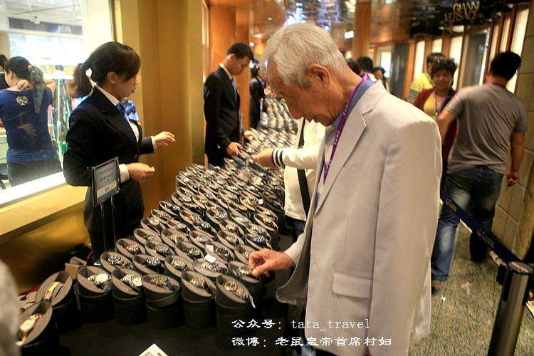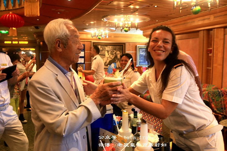 明天就要上岸了,92老正太还想在船上多转转。于是,皇帝就陪着他在二楼三楼转悠,看别人打麻将、视察免税店、品尝鸡尾酒、与船员拍照等等。总之,有点意犹未尽,有点不舍。