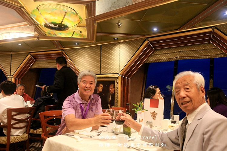 席间,船长携船上高管和一干服务人员问候大家。92老正太也跟大家一起挥动餐巾向全体船员表示谢意。