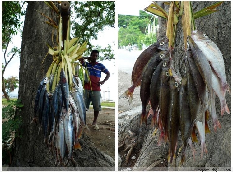 东帝汶海洋资源丰富,海产品种类不少,在街上随处可见这种将鱼是串起来卖的小贩。