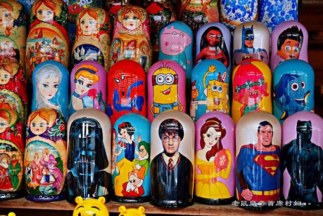 但小朋友的市场毕竟有限。所以近些年来,套娃造型也突破了最初的人设,增加了很多新鲜的元素。不仅有很多俄罗斯以及其他国家的名人被做成套娃形象,甚至迪士尼的卡通人物也纷纷粉末登场。