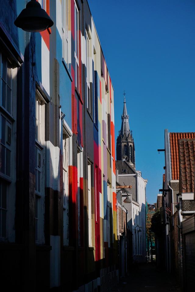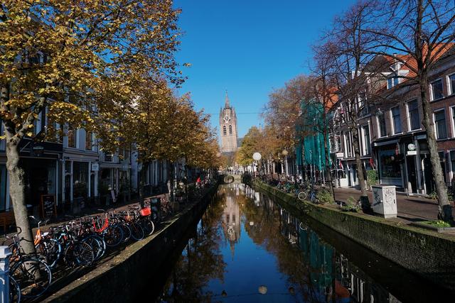 荷兰是一个靠水而居的国度,全国几乎都处于海平面之下,因此无论是阿姆斯特丹还是鹿特丹,都是河道纵横,这样的场景也出现在南荷兰的代尔夫特。代尔夫特位于阿姆斯特丹和海牙之间,距离海牙仅10公里左右,从阿姆斯特斯基夫机场出发每15分钟左右有一列火车,45分钟就可以到代尔夫特火车站,从代尔夫特火车站去老城,步行可达,这里的街景和阿姆斯特丹有几分相似,但要安静得多多。
