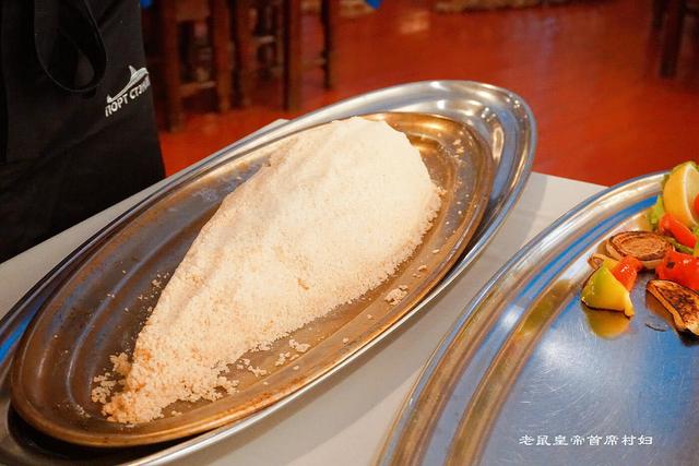 店家特色菜之盐焗鱼:整条鱼外裹上厚厚一层海盐,烤熟。