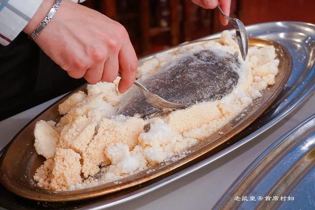 上桌后,先将盐层敲开拨干净,用叉和勺子去刺。