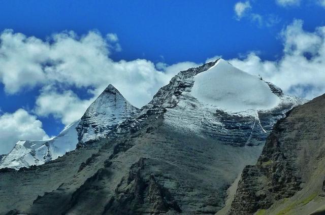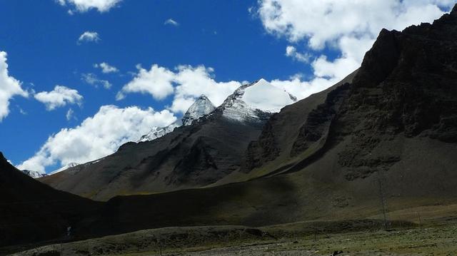 车子驶离卡若拉片刻,回头再看冰川,发现景色更加漂亮!拉轨岗日山主峰宁金抗沙峰山体雄伟,危岩嵯峨,顶部尖锥突兀,晶莹剔透直插云霄,顶端反射出云彩的形状和明暗,其美堪称动人心魄。它悠然凌驾于圣湖之上,因此才得此名,意思是“夜叉神住在高贵的雪山上”,海拔7206米。