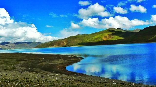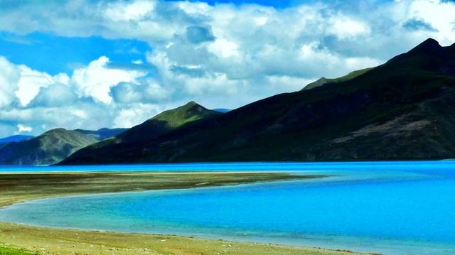 羊湖的美早已超脱了一般意义上的定义,所有的形容词在她跟前都显得暗淡无光过于轻描淡写。那湖水清澈纯明,微风拂过,湖面泛起的粼粼波光如同凡天洒下的碎钻般璀璨耀眼;那蓝充分显示了造物主的厚爱,仿佛融入了世间所有的祝福和期待,深蓝、浅蓝、宝蓝、靛蓝等各种各样的蓝色交陈杂错融为一体,充满了变化却又和谐如一,所有的过渡都显得那样的自然柔和。