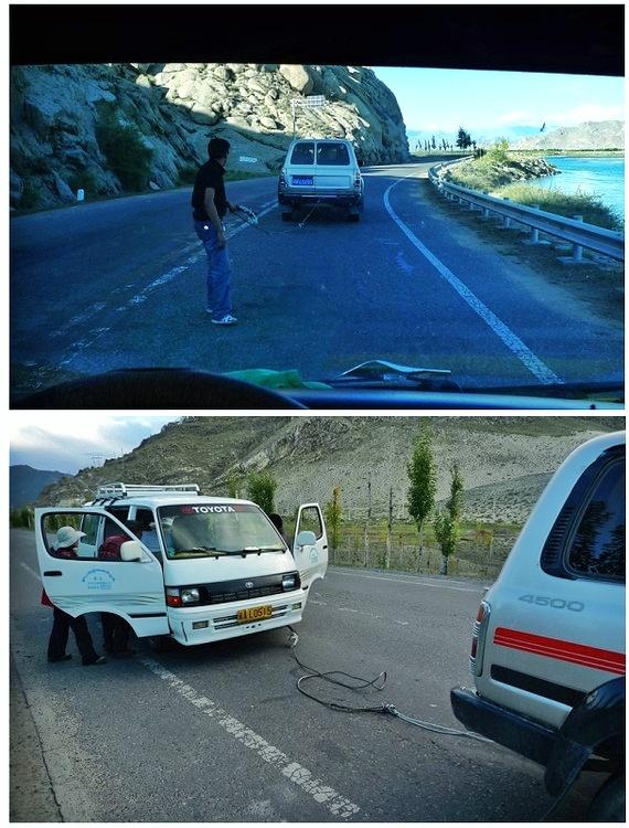 拍完拉萨河,我们幸运地遇到了顿珠的一位开丰田4500的朋友,于是那辆4500便担当起拖我们前进的艰巨任务。拖了大约几公里,遇检查站将我们叫停,大家集体冲着警察狂叫: