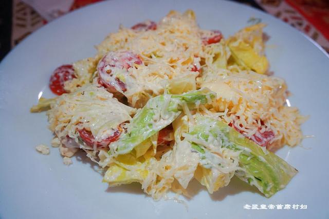 点的第一道菜是蔬菜沙拉,乍一看貌似内容很丰富,有白菜胡萝卜洋葱西红柿玉米粒等等。不过,最让中国人受不了的是:厨师放了很多很多很多cheese,好像cheese不要钱似的。
