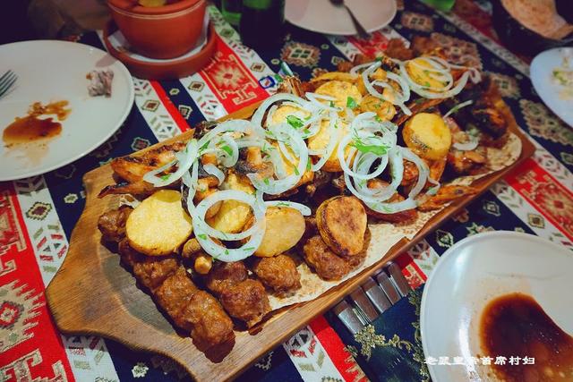 这是当天最硬的一道主菜:烤肉拼盘。有羊肉、牛肉和鸡肉,还配了烤土豆和香菇,上面撒有生洋葱圈。口感嘛,感觉烤的过火了,肉有点硬。可是为什么肉过火了土豆却是生的呢?幸好,蘑菇非常好吃。