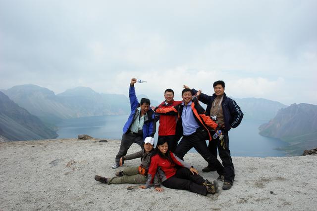 2006年7月22日,老鼠皇帝与来自5个不同省市的另外6位强驴用7天时间完成了长白山雨季大穿越,并登顶海拔2501米的望天鹅主峰。图为大家在长白山天池合影。
