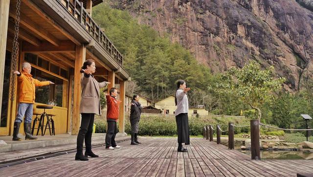 早饭后,我们来到还珠楼(旗山侠隐酒店大堂)。面对绿水青山轻雾闲云,在好朋友,遂昌县汤显祖纪念馆前任馆长文君女士带领下学打太极拳。