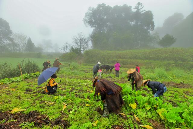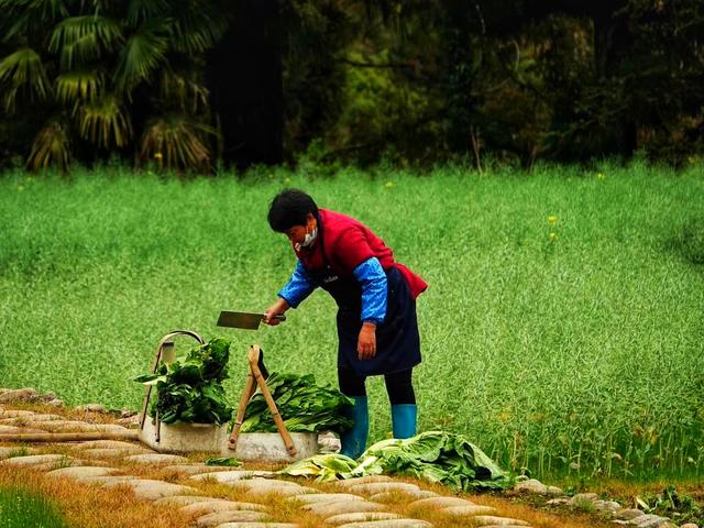 小小茶园村坐落在半山腰,四周被群山环抱,没有大块平整的可耕地。在村里随处可见小径边上或篱笆墙边那一块块迷你不规则的地块儿,上面被主人种下了各种农作物。我们每一天每一顿的桌上菜,就是图中这位农妇每一分每一秒的劳动成果。