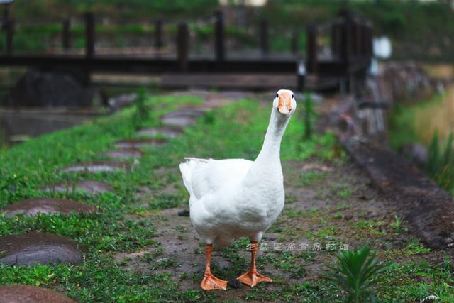 还珠楼前面的水中亭台上,赫然一只大白鹅,骄傲地挺着胸膛,恍若逡巡的将军。它叫白掌柜,是茶园村唯一一只鹅。每天我们都能在还珠楼前的水塘前看到她自由自在地散步。它的主人,村民老曹告诉我们,白掌柜是一只母鹅,平均每两天生一只蛋。这句话把村妇的心搞得痒痒的。