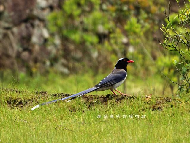 但茶园村真正的主人鸟另有归属,这种鸟当地人以形起名,称其为长尾鸟,学名是红嘴蓝鹊。长尾鸟体长54-65厘米,嘴和脚均为红色,头、颈、喉和胸则是黑色,头顶至后颈有一块白色至淡蓝白色或紫灰色块斑,其余上体紫蓝灰色或淡蓝灰褐色。
