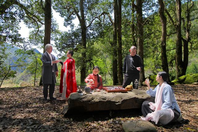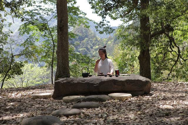在茶园村,有一片非常珍贵的古树林,有300余棵数百年的古树组成,神奇的是这片自然形成、人工干预极少的古树林四周围合、中间却有一大片空地。艺术家徐冰在这里做了件装置艺术:刻着其独创的天书的大石头,刚好用来做茶台。