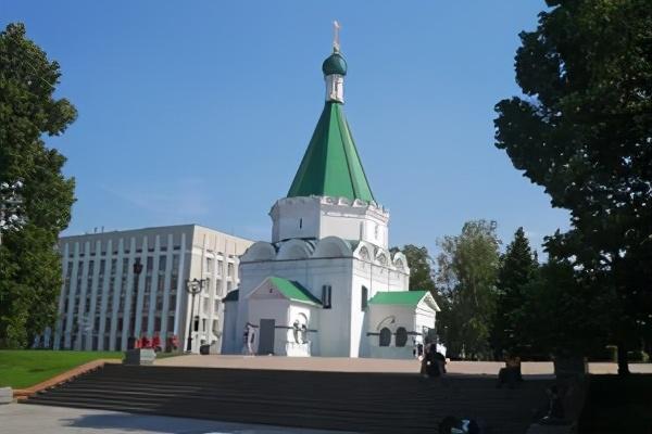 图为下诺夫哥罗德市著名的天使长米迦勒大教堂。俄罗斯历史上的民族英雄、俄罗斯人民反抗波兰军队之解放战争的组织者库兹马•米宁长眠其内。
