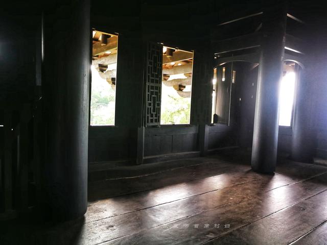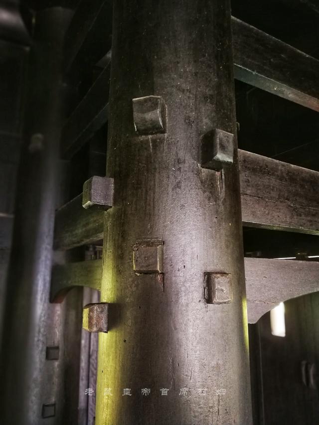 通过逼仄的楼梯上到二楼,会看到四根大内柱,承受着上层楼板、梁架配柱、阁瓦和脊饰等沉重的负担。