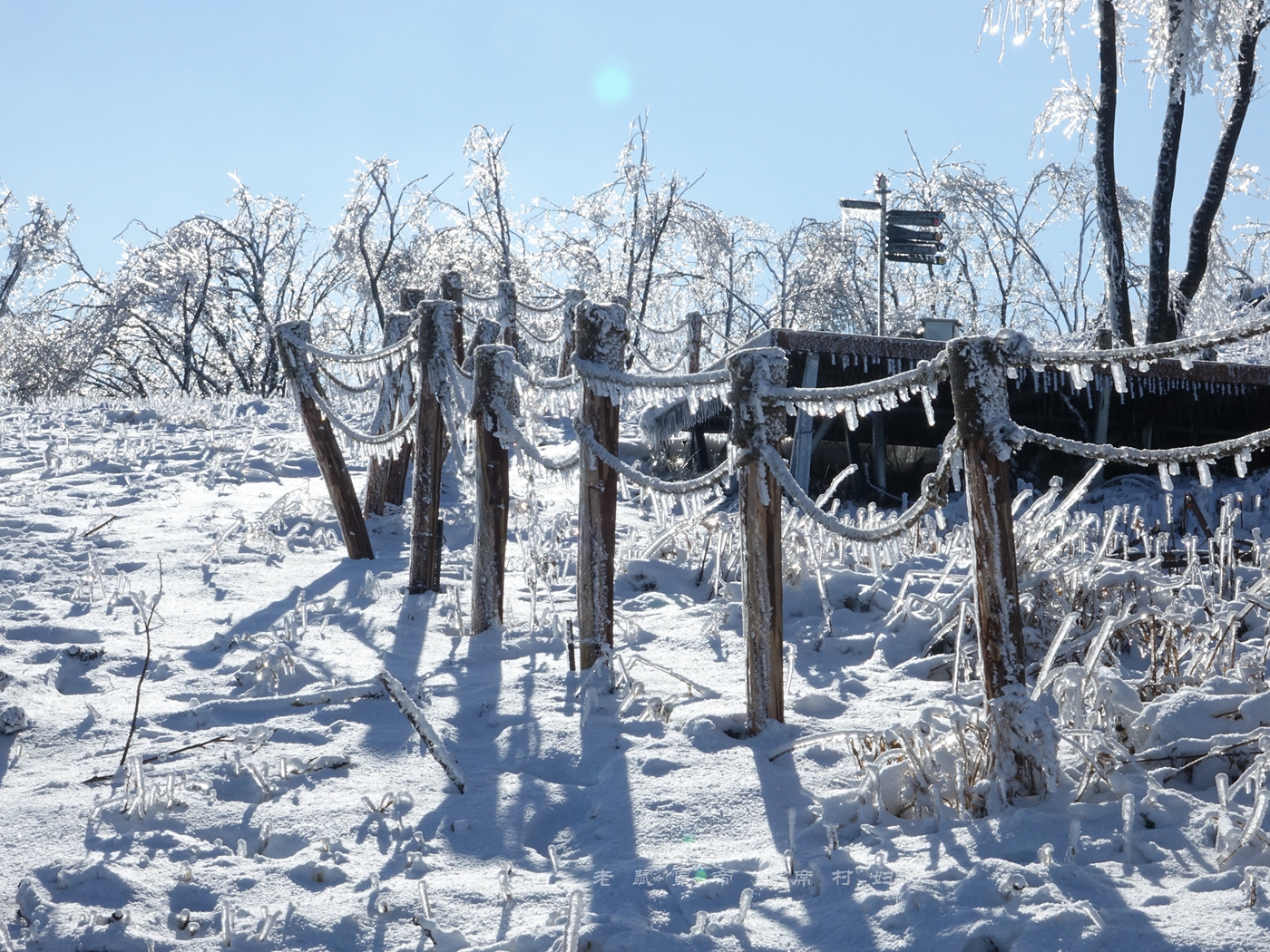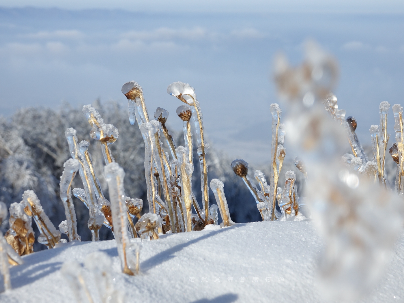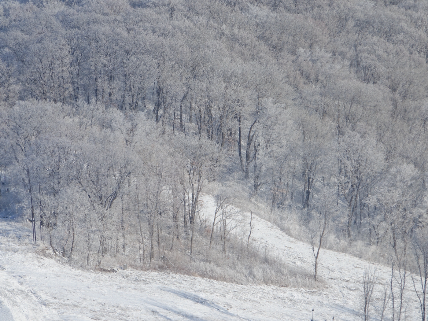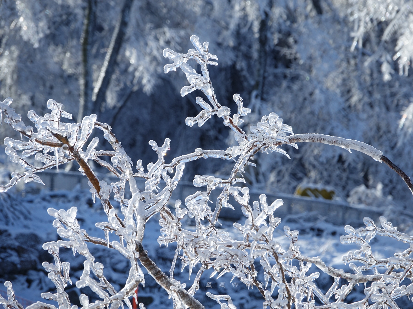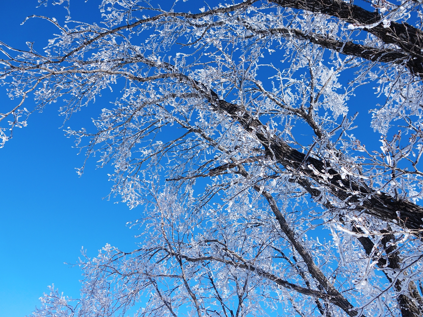 树木叶子尽数脱落,光秃秃的树干树枝都被晶莹剔透的冰包裹其中,仿佛开满冰花的大树。而这样的树还不是一棵,无数的大树乔木连成一片,是水晶的世界,在阳光的照耀下闪闪发光,美得让人不敢高声而语,生怕亵渎了它的美。