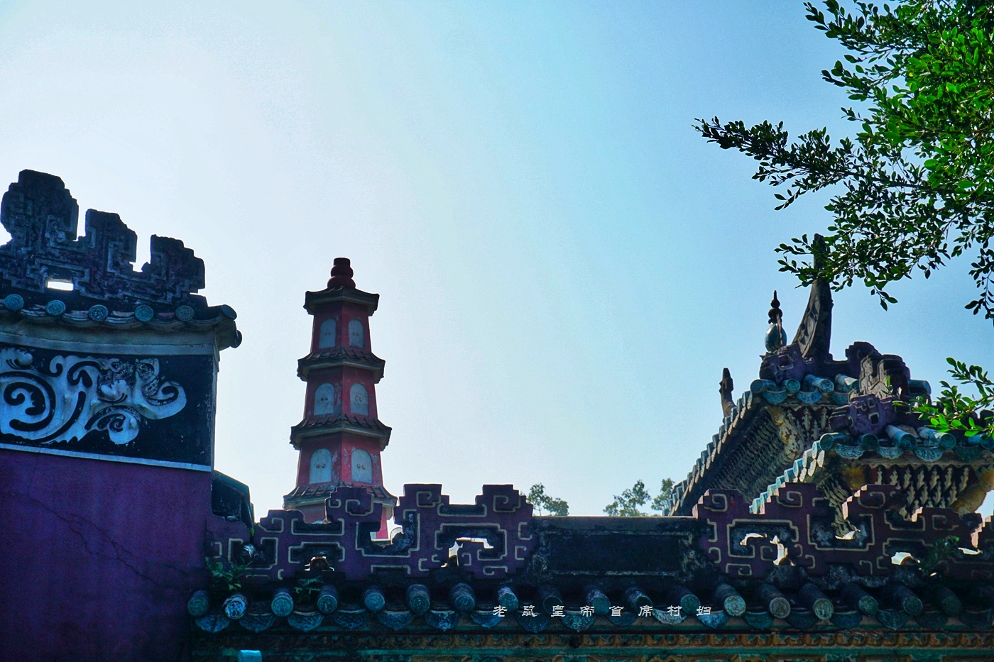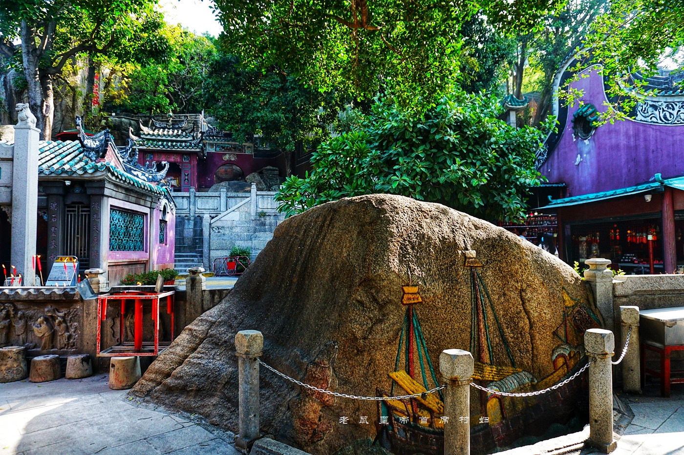 院内一块名为“洋石船”的巨石上,刻有一艘古代的海船,船的桅杆上挂着一面写有“利涉大川”的幡旗。
